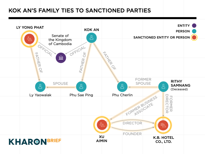 - Another of Kok’s daughters married Rithy Samnang. Before his death in 2022, Rithy served as the chair of K.B. Hotel Co. Ltd. and as a director at two other companies where Kok also held director positions. The U.K. and U.S. sanctioned K.B. Hotel in 2023 and in September, respectively, for its role in facilitating transnational scam operations using forced labor. In that same designation, the Treasury Department also sanctioned K.B. Hotel co-founder Xu Aimin, who previously was sentenced to a 10-year prison term in China for operating a billion-dollar online gambling ring.