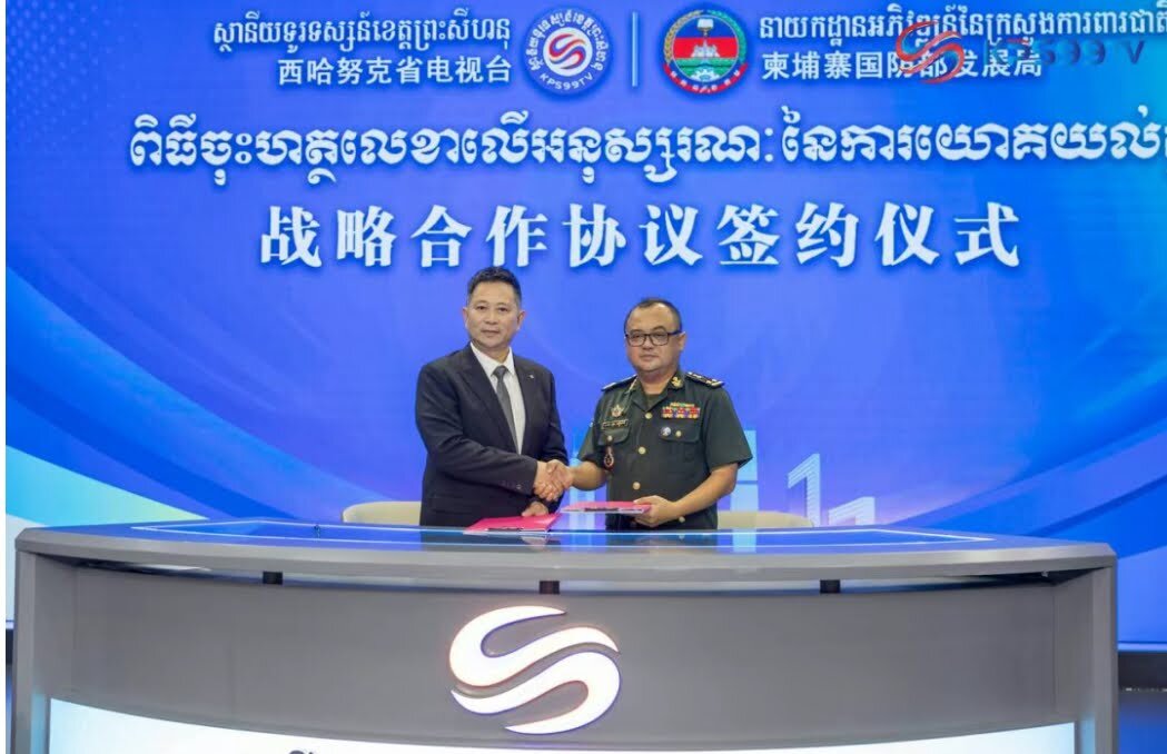 Liu Xiao, station manager of KPS99 Media Television, shakes hands with a Cambodian Ministry of Defense official at a signing ceremony Oct. 1. (KPS99)