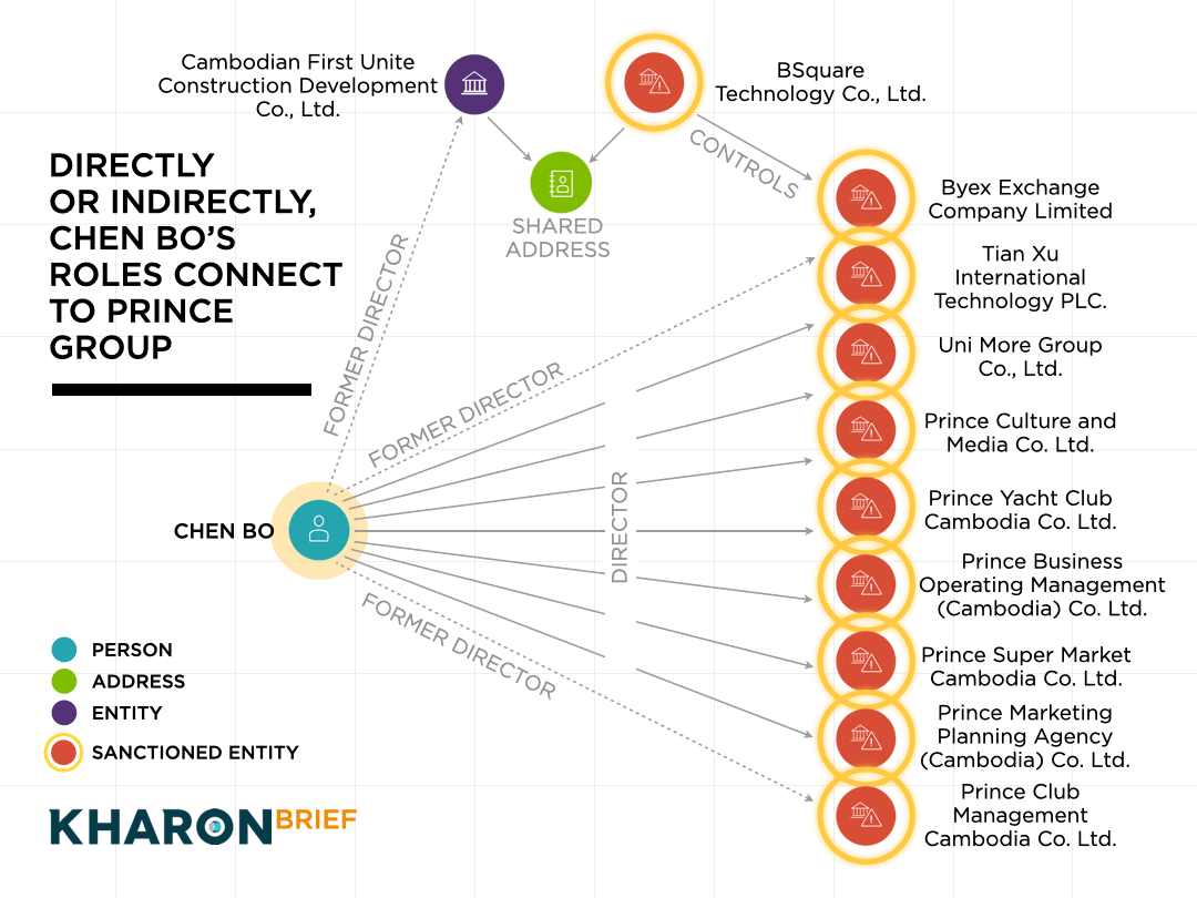 From Kharon’s research: Cambodian corporate records list Tian Xu’s director as Cambodian national Chen Bo. Chen, whom corporate records list as the current or former director of at least eight sanctioned Prince Group companies, including the BSquare subsidiary Byex Exchange, has not been targeted by sanctions himself.