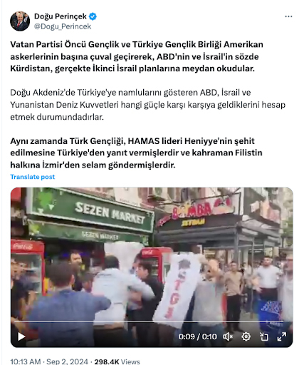 In a post on X, Perinçek celebrated Monday’s attack as “a challenge” to U.S. and Israeli government policies, and as a response to the recent death of Hamas leader Ismail Haniyeh in Iran.