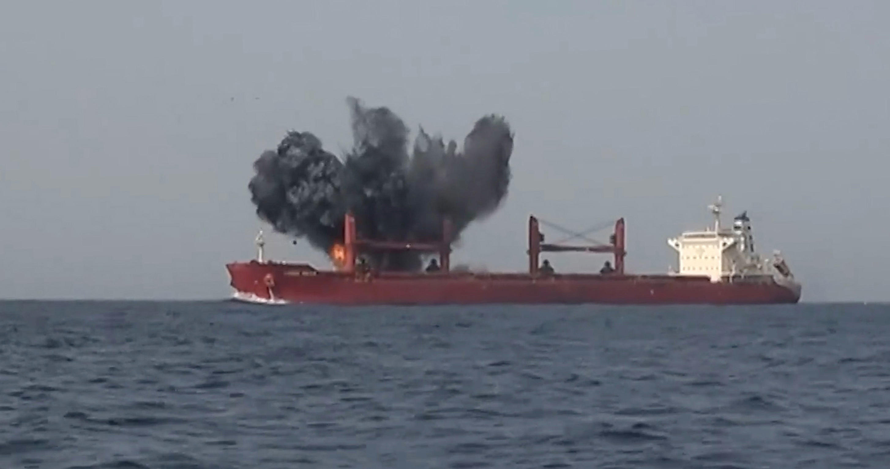 A screengrab from a Houthi-provided video shows the targeting of the Magic Seas, a Liberian-flagged and Greek-operated commercial vessel, last July. (Handout photo by Houthi Media Center/Getty Images)